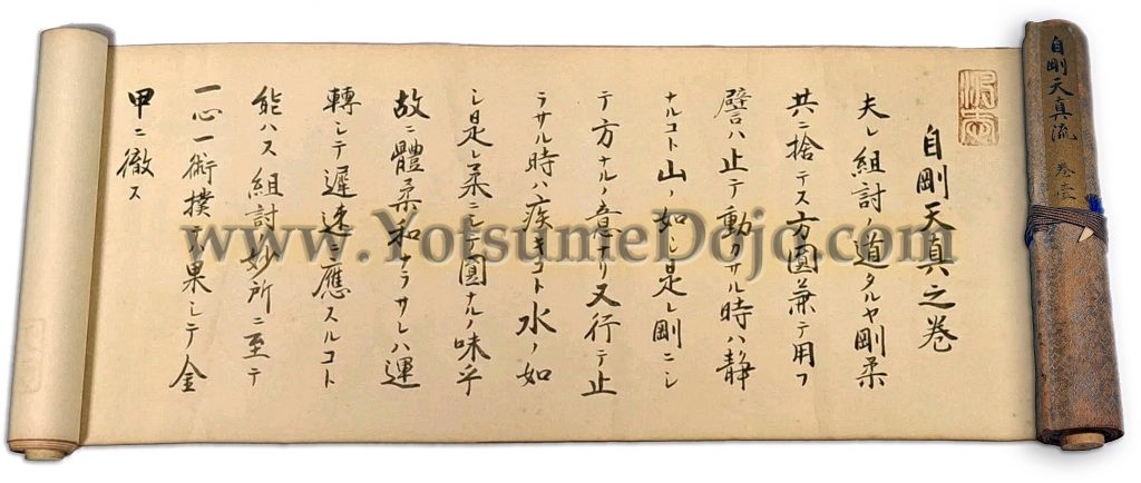 The contents of this particular scroll detail the secret principles of their style of Kumiuchi and the Kasatsu (killing and reviving) methods. This particular ryu-ha had an extensive system of Kenpo Sakatsu 拳法殺活 (striking killing methods) that were a closely guarded secret of the school. It is a blend of Atemi-waza and medical knowledge.
